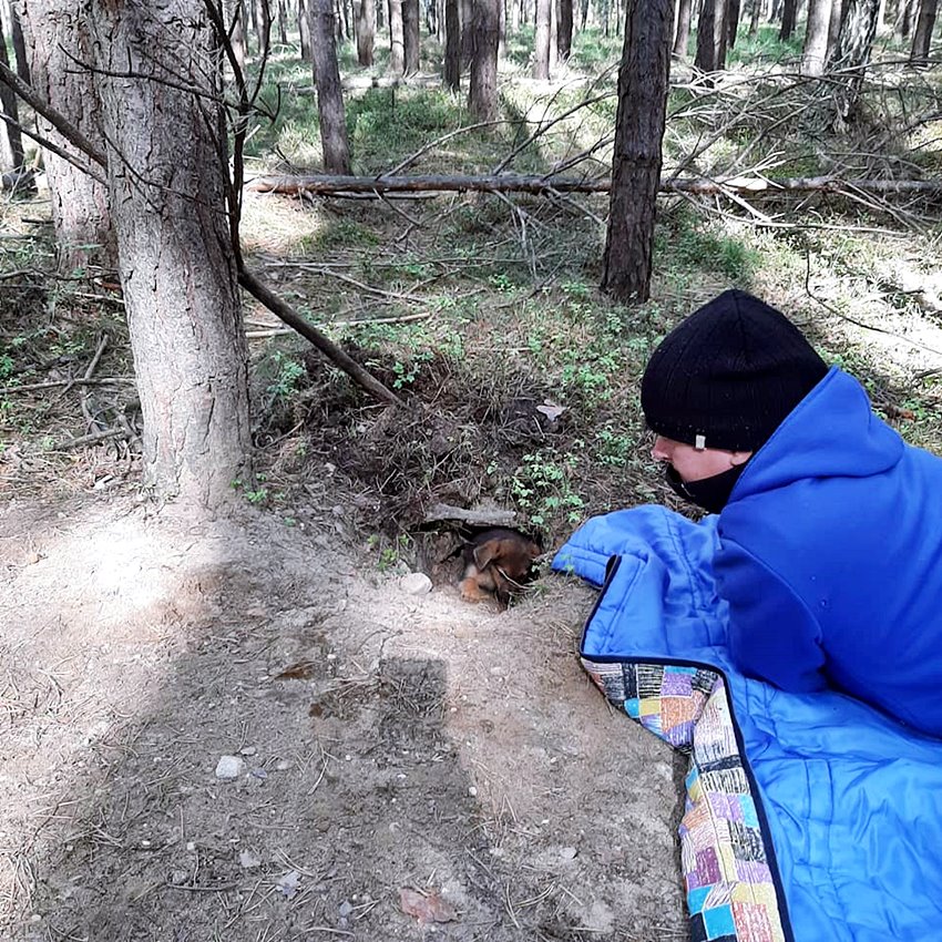 Wolontariusze z Przytul Pyska relacjonują akcję ratowania psów żyjących w leśnej norze.