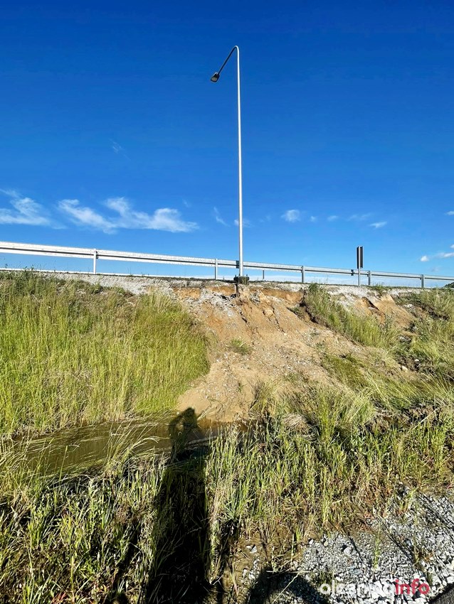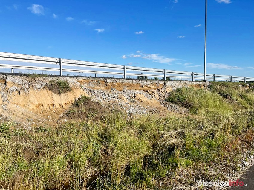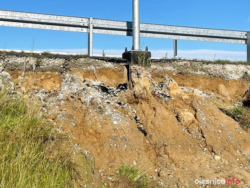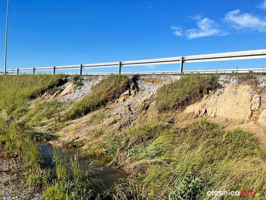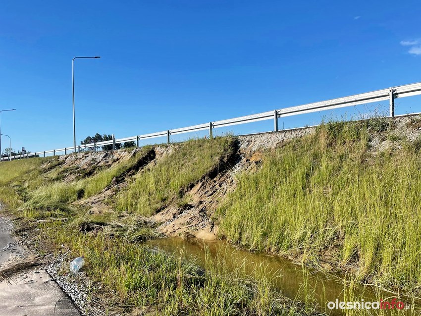 – Właśnie jedziemy wzdłuż wschodniej obwodnicy Oleśnicy i to ci widać po wczorajszej ulewie to jakaś masakra – pisze pan Piotr. – Takie widoki są na całej długości drogi od przejazdu kolejowego w stronę Alucromu. Przecież ta droga została oddana niedawno do użytku. Dzisiaj cały profil drogi widać po osunięciu.