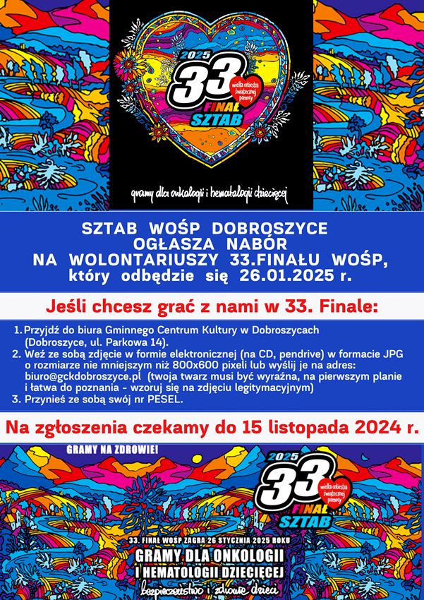 – Dołącz do nas podczas 33. Finału WOŚP, który odbędzie się 26 stycznia 2025 r. razem zagramy dla onkologii i hematologii dziecięcej, wspierając najmłodszych bohaterów w walce o zdrowie – apeluje dobroszycki sztab, który, jak co roku, znajduje się w Gminnym Centrum Kultury.