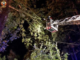 Po dotarciu na miejsce Pogotowia Energetycznego potwierdzono, że linie, na których leży korona drzewa, jest linią telekomunikacyjną, w związku z czym przystąpiono do stopniowego cięcia drzewa z kosza drabiny.