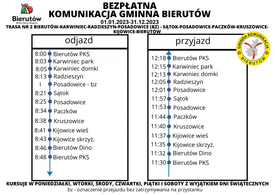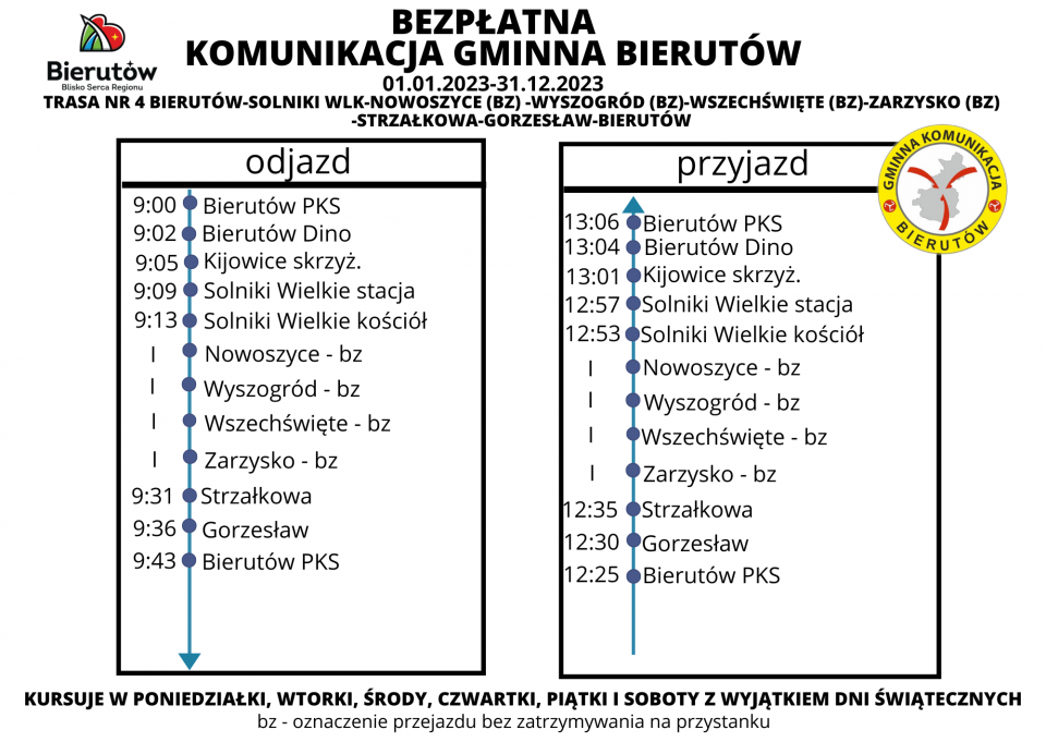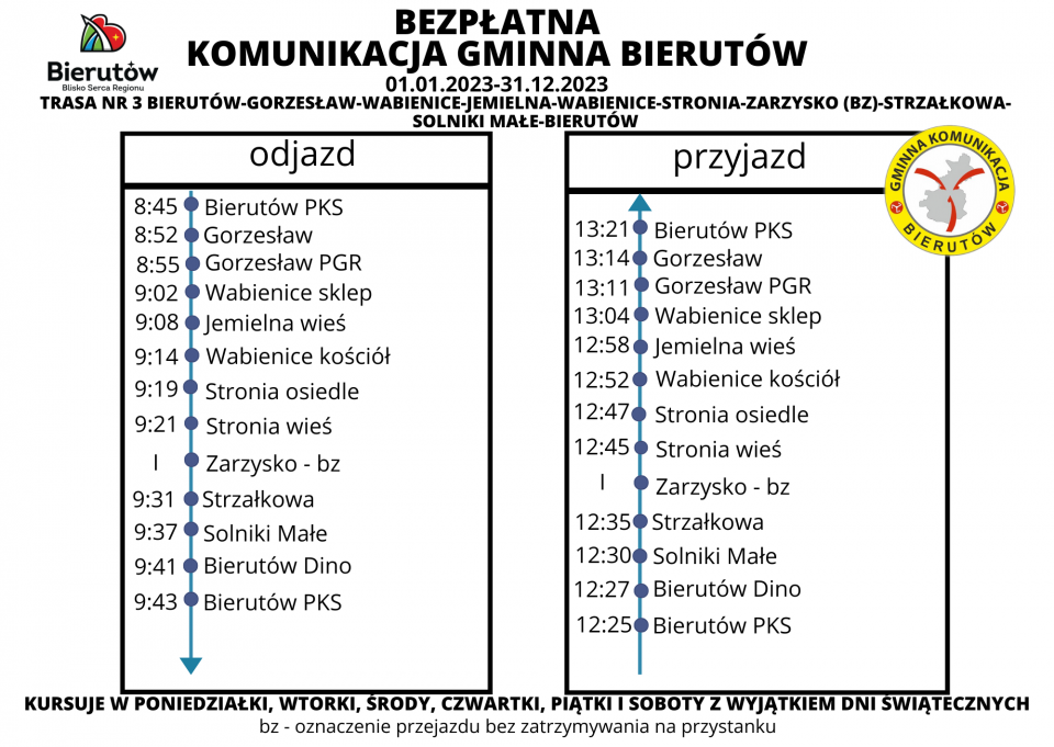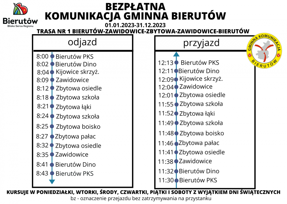 Urząd Miasta i Gminy w Bierutowie przedstawił rozkład jazdy komunikacji autobusowej na 2023 rok. Przypomnijmy, że komunikacja w gminie Bierutów jest bezpłatna, a autobusy kursują na czterech trasach.