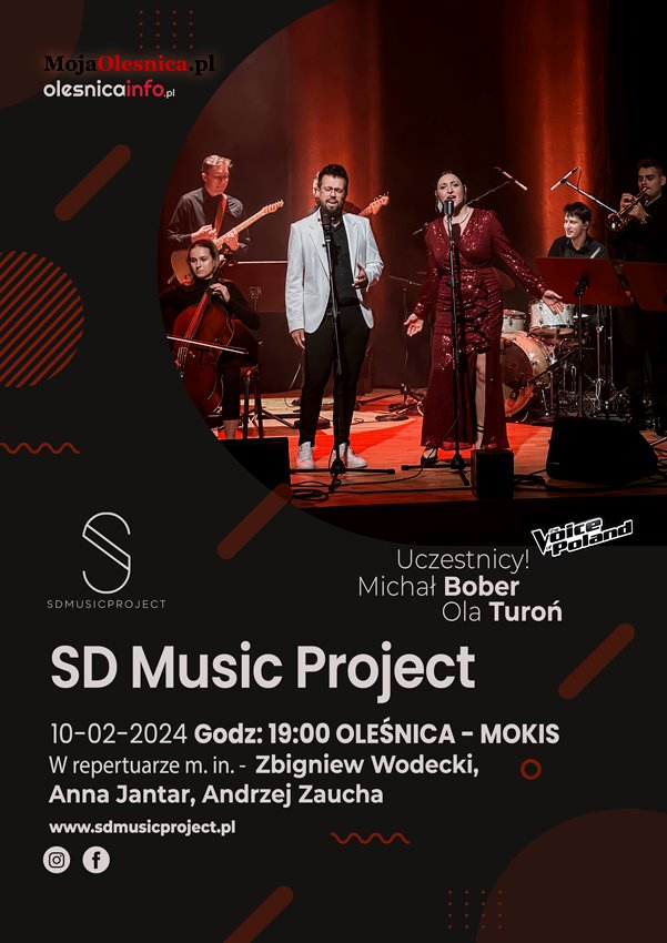 SDmusicproject to zespół, który będzie towarzyszył oleśnickiej publiczności w ten piękny lutowy wieczór. Odkrywcze aranżacje, świetna muzyka, wspaniała atmosfera- to wszystko zaoferuje Państwu SDmusicproject, w którego skład wchodzi 13 wybitnych muzyków reprezentujących sobą pasję, profesjonalizm a także miłość do muzyki.