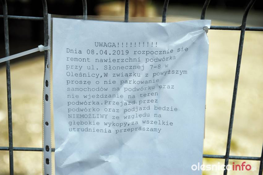 Zakład Budynków Komunalnych w Oleśnicy informuje, że rozpoczęły się roboty budowlane polegające na utwardzeniu terenu – podwórza przy ul. Słonecznej 7-8 w Oleśnicy.