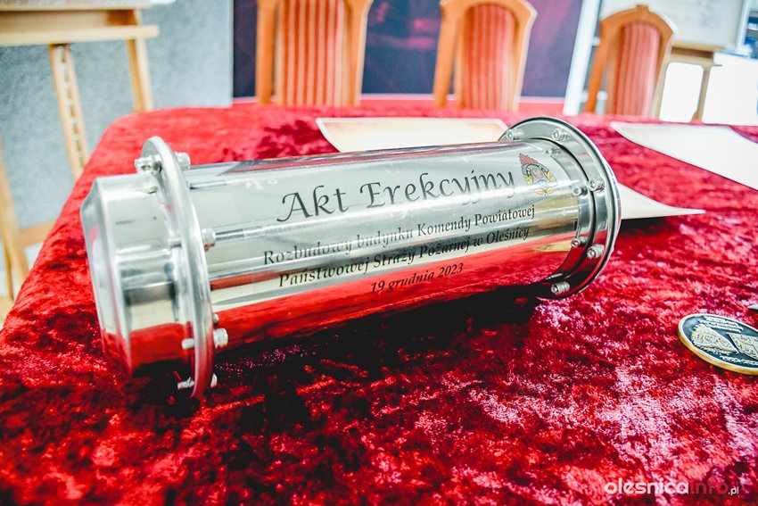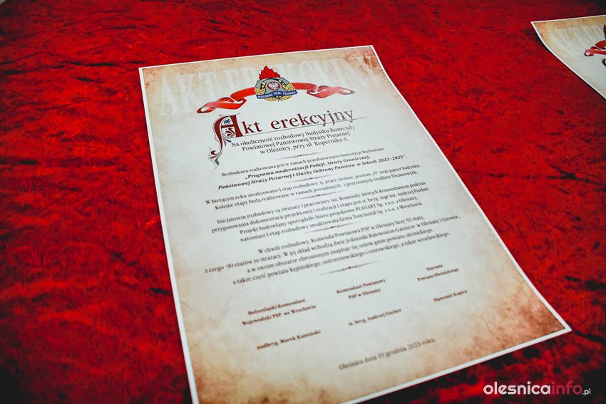 Podczas dzisiejszej uroczystości komendant odczytał akt erekcyjny, który wraz z innymi dokumentami, trafił do specjalnej tuby. Tę zaproszeni goście wraz z komendantem zamurowali w ścianie nowo powstającego budynku.