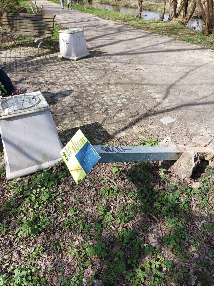 – Na tzw. Wodociągach, uaktywnili się wandale. Jeden z karmników został zerwany i wylądował w rzeczce. Wraz z karmnikiem wrzucono pokrywy śmietników, elementy ławek, nawet przewrócony został słupek z znakiem zodiaku – pisze oleśnicki aktywista Wiesław Mazurkiewicz.