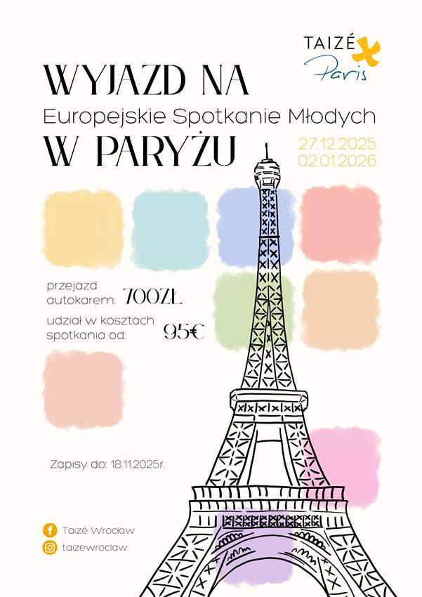 Parafia św. Jana w Oleśnicy zaprasza na spotkanie organizacyjne osoby w wieku 18-35 chcące uczestniczyć w Europejskim Spotkaniu Młodych organizowanym w dniach 28.12 – 1.01 w Paryżu. Spotkanie organizacyjne odbędzie się w piątek o godz. 19.45 w salce przy kościele św. Trójcy w Oleśnicy na ulicy. Łużyckiej 4.