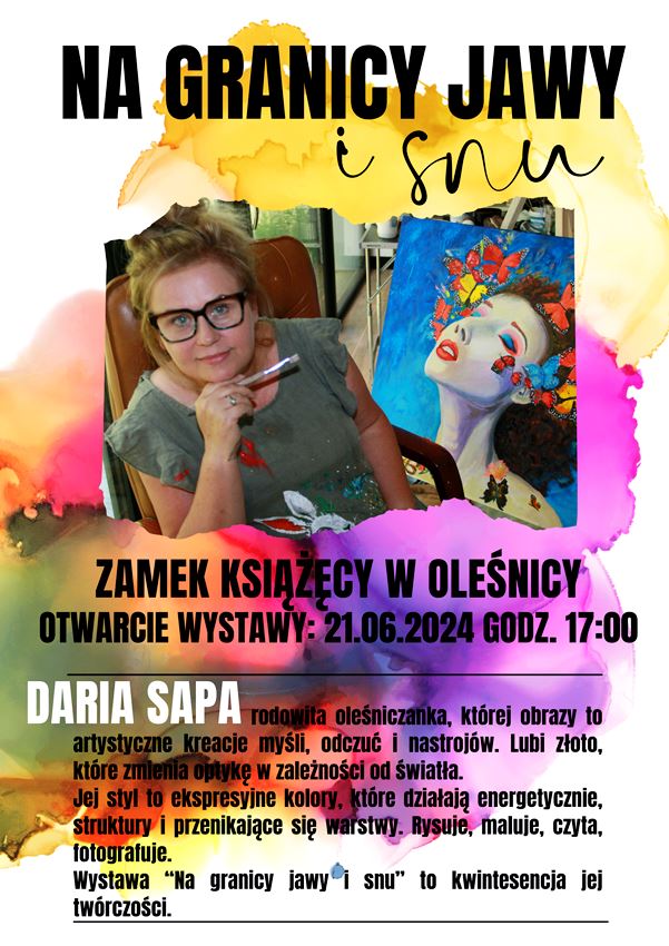 21 czerwca o godz. 17 w Zamku Książęcym w Oleśnicy odbędzie się uroczysty wernisaż wystawy malarskiej „Na granicy jawy i snu” autorstwa artystki Darii Sapy, rodowitej oleśniczanki.