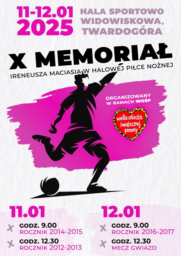 W najbliższy weekend 11 i 12 stycznia w Twardogórze odbędzie się X Memoriał w Halowej Piłce Nożnej tragicznie zmarłego dziennikarza Ireneusza Maciasia. Dzisiaj jest ostatni dzień zgłaszania drużyn.