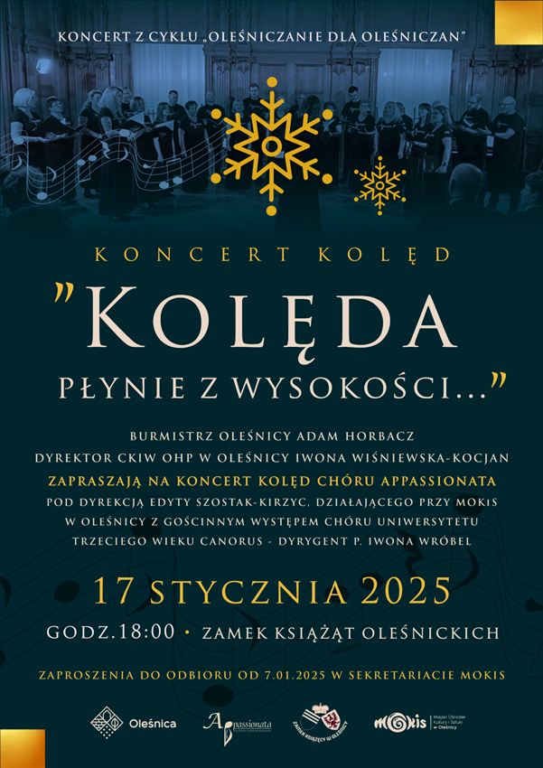 Utwory wykonają artyści Oleśnickiego Kameralnego chóru APPASSIONATA pod kierownictwem Edyty Szostak-Kirzyc działającego przy MOKiS w Oleśnicy wraz z gościnnym występem chóru Uniwersytetu Trzeciego Wieku Canorus, pod kierownictwem Iwony Wróbel. Koncert odbędzie się 17 stycznia o godzinie 18 w Zamku Książąt Oleśnickich. Zaproszenia będą do odbioru od 07.01.2025 w sekretariacie MOKiS.