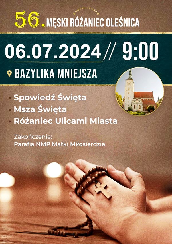 – Zapraszamy wszystkich mężczyzn i młodzież męską na wakacyjny 56. Męski Różaniec, który odbędzie się w najbliższą sobotę 6 lipca – poinformowali organizatorzy. – Rozpoczynamy mszą świętą o godz. 9 w bazylice mniejszej p.w. św. Jana Apostoła i Ewangelisty przy oleśnickim Rynku. Następnie przejdziemy ulicami naszego miasta, a modlitwę zakończymy w kościele p.w. NMP Matki Miłosierdzia przy ul. Wileńskiej. Jeszcze raz zapraszamy do wspólnej modlitwy!