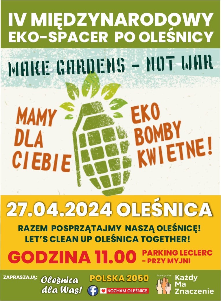 Miłość do Oleśnicy nie ma narodowości, a oleśniczanie to mili i otwarci ludzie – mówi inicjator akcji. – Mamy worki na śmieci, rękawice, poczęstunek na końcu trasy, dyplomy dla wszystkich i bomby kwietne do zasiania! Pogoda ma być świetna więc dołączajcie! Jeżeli możesz przynieść ciasto to będzie super! Nie finansuje nas miasto, ani żaden urząd wszystko organizujemy ze składek grupy przyjaciół.