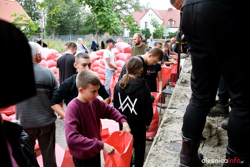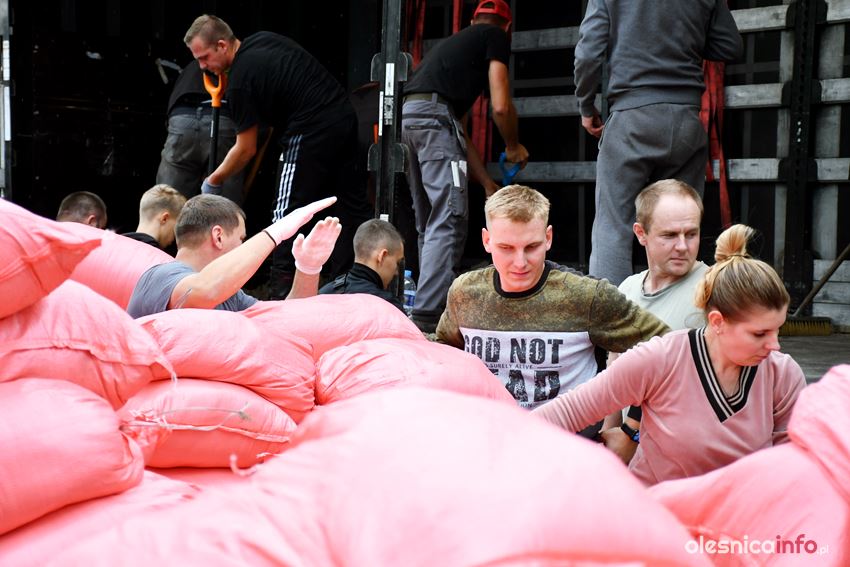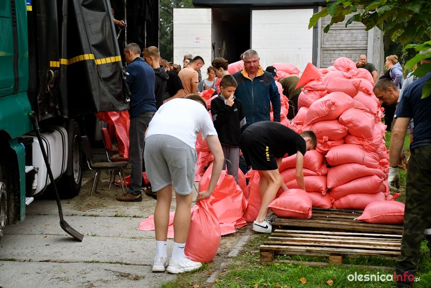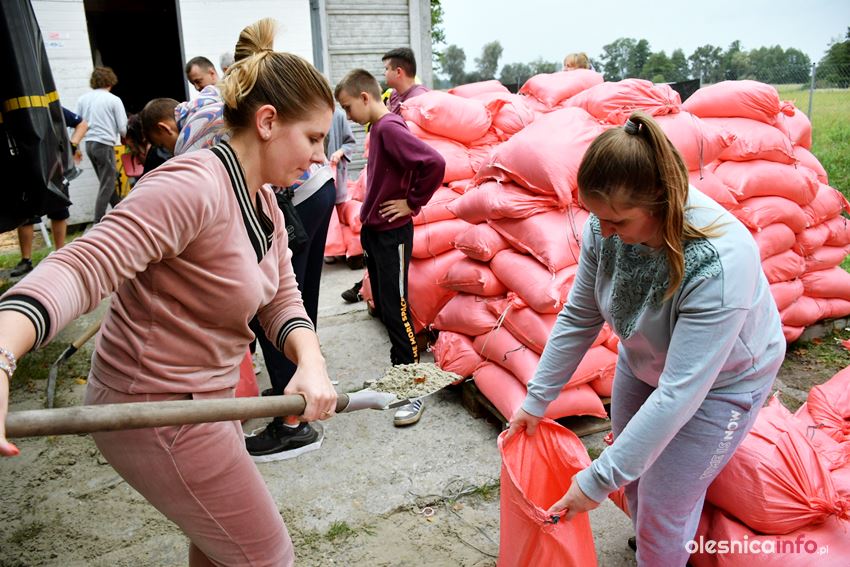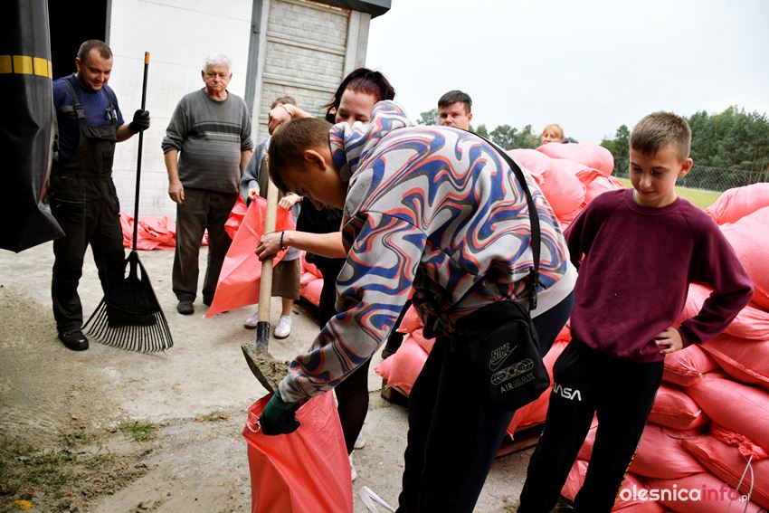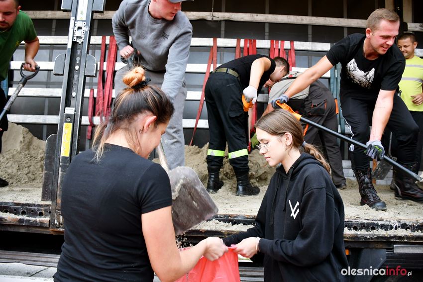 Piasek pakowali do worków strażacy, mieszkańcy, dzieci. W niecałą godzinę przygotowano 750 worków, które trafią do osób mieszkających na najbardziej zagrożonych zalaniem terenach.