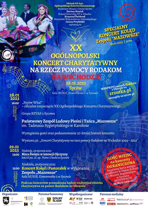 28 i 29 stycznia Syców będzie świętował jubileuszową XX. edycję Ogólnopolskiego Koncertu Charytatywnego na rzecz Pomocy Rodakom na Wschodzie.