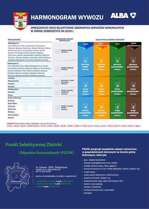 Urząd Gminy w Dobroszycach przypomina, że odbiór odpadów komunalnych, przewidziany na czwarty poniedziałek miesiąca, tj. 22 kwietnia, odbędzie się, zgodnie z zaplanowanym harmonogramem w dniu 29 kwietnia. Zmiana dotyczy Kolonii Strzelce, Bartkowa, Białego Błota,Holendrów, Malerzowa, Miodar, Nowosiedlic oraz Nowicy.