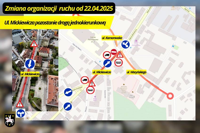 - Na ul. Mickiewicza (od Urzędu Miasta i Gminy do świateł przy ul. Komorowskiej/Waryńskiego) ruch będzie prowadzony tylko w jednym kierunku – od ul. Jana Pawła II w stronę świateł.