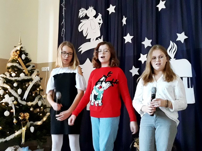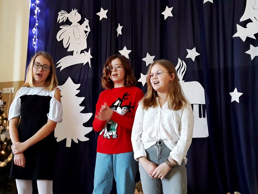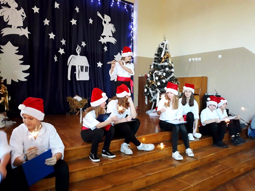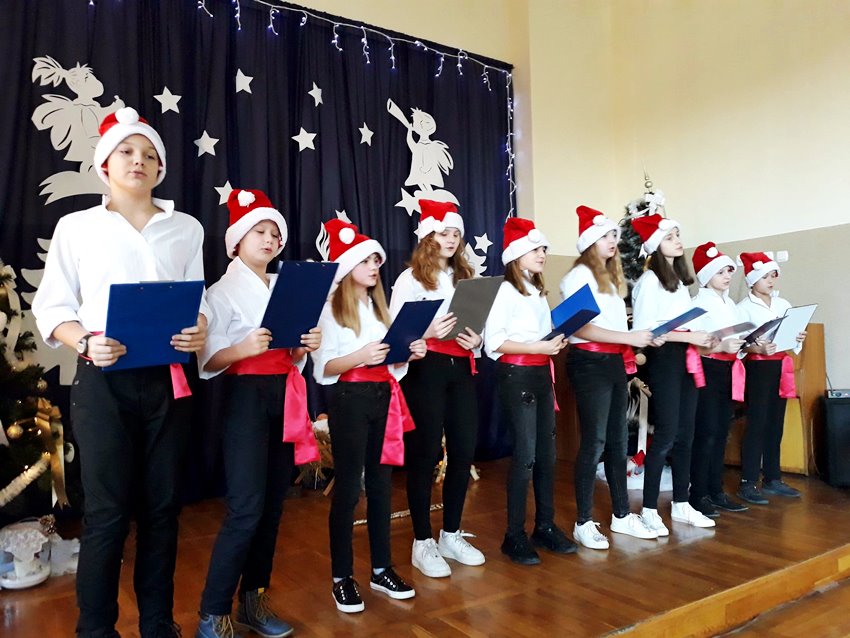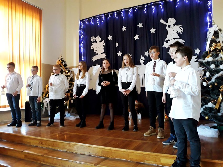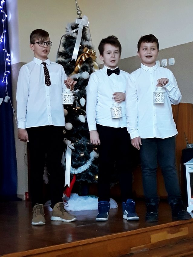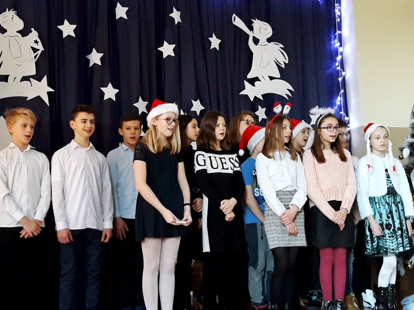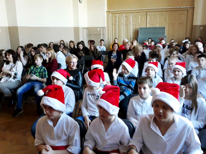 Cała społeczność szkolna- uczniowie, rodzice, nauczyciele i dyrekcja zadbała o to, by dzień ten był dniem wyjątkowym. W świąteczną atmosferę wprowadziło nas rozstrzygnięcie szkolnego konkursu na najpiękniejszą kartkę i/ lub stroik bożonarodzeniowy. Laureaci otrzymali pamiątkowe dyplomy i nagrody ufundowane przez radę rodziców. A potem… rozbrzmiały dźwięki kolęd, pastorałek i piosenek o tematyce świątecznej. Nie było na sali osoby, która nie nuciłaby usłyszanych utworów. Okazało się, że wspólne muzykowanie to doskonały pomysł. Brawurowy występ Mikołajek z klasy Va zakończył przedświąteczne spotkanie. – Mamy nadzieję, że Koncert Kolęd stanowić będzie odtąd piękną tradycję w naszej szkole w przeddzień najbardziej wzruszających polskich świąt – mówią nauczyciele.