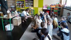 Panie Agnieszka Gurboda i Marta Grusza odpowiedziały dzieciom na czym polega praca leśniczego i dlaczego należy dbać o las. Uczniowie w podziękowaniu za ciekawą lekcję przyrody zaśpiewali piosenkę o ziarenku.
