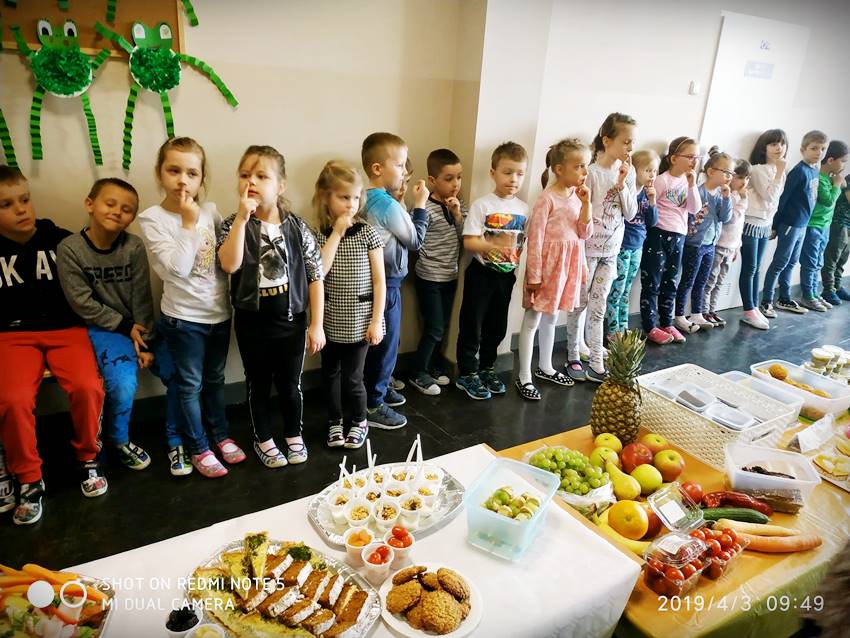 Rodzice wraz z dziećmi przygotowali mnóstwo wspaniałych smakołyków, którymi zastawiono stoły. – Bez przesady można powiedzieć, że stoły uginały się od owocowych szaszłyków i koreczków, sałatek, jogurtów, przekąsek. Były fantazyjne węże warzywne, ciasteczka z różnymi ziarnami, marchewkowe i dyniowe babeczki i ciasta, tarty, koktajle, winogronowe jeże, kolorowe kanapeczki, owoce i wiele innych zdrowych dań – relacjonują organizatorzy wydarzenia. – Dzieci z zachwytem oglądały stoły, które kusiły kolorami i zapachami… A później była wspaniała, zdrowa uczta, która trwała i trwała, bo trzeba było przecież wszystkiego spróbować.