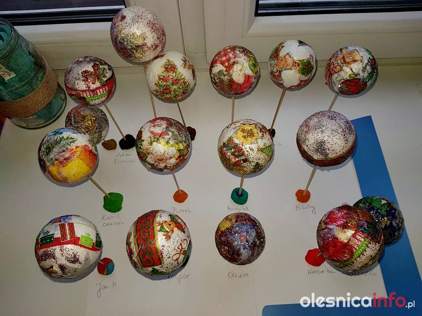Z kolei uczniowie klasy II a, dzięki uprzejmości nauczycielki Stanisławy Bulandy, mogli się sprawdzić w wykonywaniu prac metodą Decoupage. Z okazji zbliżających się Świąt Bożego Narodzenia każdy z uczniów wykonał tą metodą swoją własną bombkę. – Trzeba było dobrze wysłuchać tego na czym polega metoda zdobienia decoupage, nim można było wziąć się za działanie – informuje SP 1.