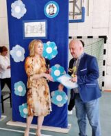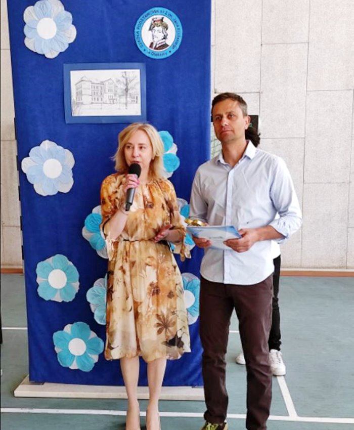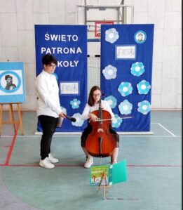 W czasie uroczystego apelu społeczność uczniowska miała okazję poznać życiorys patrona a delegacje z klas drugich i ósmych złożyły wiązanki pod tablicami upamiętniającymi patrona. Uczniowie klas drugich zaśpiewali piosenkę pt. „Imieniny szkoły” a uczennica klasy 8d – Oliwia Borkowska zagrała na wiolonczeli. Zebrani obejrzeli również taniec Zuzanny Bielawskiej – uczennicy klasy 7a do piosenki „Why don’t you right” oraz pokaz szkolnej grupy tanecznej dziewcząt z klas 5-8. Podczas uroczystości po raz pierwszy nadano tytuł Przyjaciela Szkoły oraz wręczono statuetki zasłużonym rodzicom naszych uczniów – Piotrowi Błaszczakowi oraz Pawłowi Wuczkowskiemu. Grono pedagogiczne pogratulowało również Pani dyrektor Janinie Zdanowicz wygranej w konkursie na dyrektora naszej placówki. Apel przygotowali wychowawcy klas drugich i ósmych.