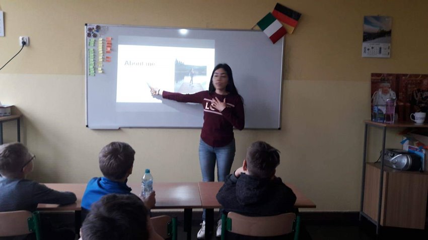 Zajęcia językowe z uczniami klas III-VIII prowadzili pełni entuzjazmu wolontariusze Fundacji Euroweek: Brenda z Meksyku oraz Isti Marta z Indonezji.